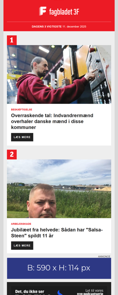 Materiale til bannerannoncering på topbanner og artikelbanner på Fagbladet3f.dk leveres som GIF, JPG eller HTLM – maks. 200 KB.
