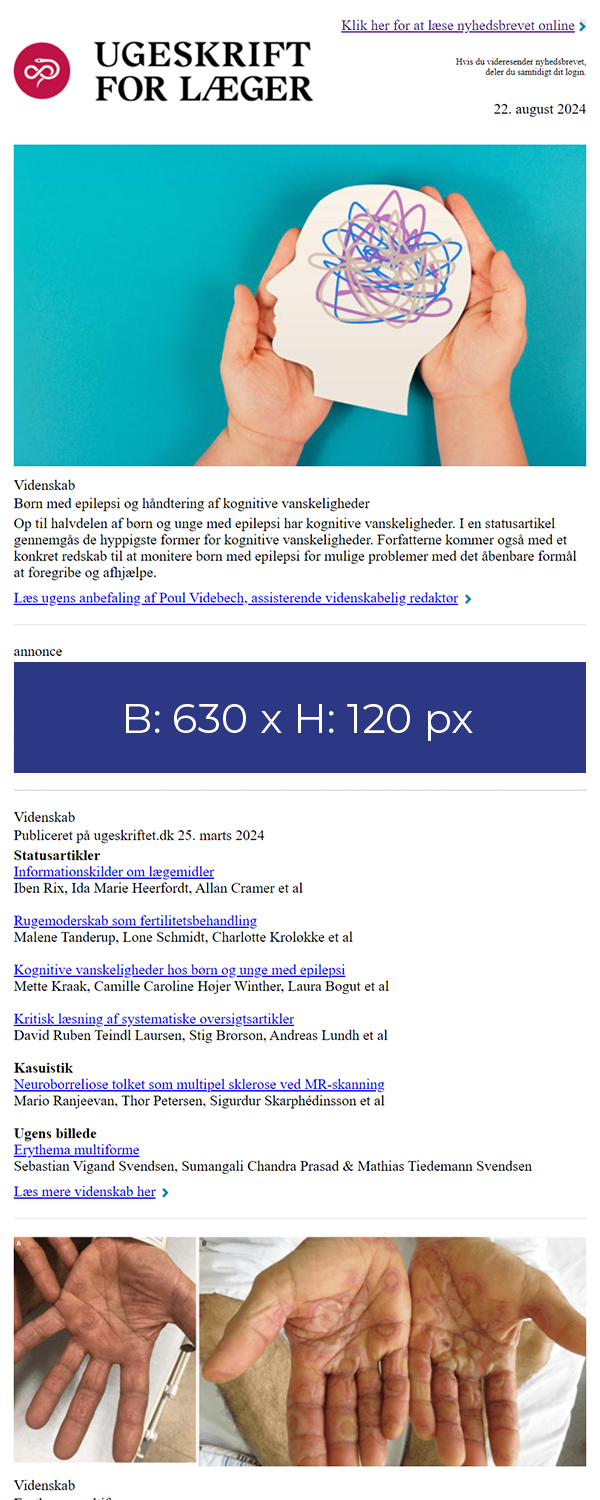 Det er muligt at have bannerannoncer og joblinks til jobannoncer på hjemmesiden Ugeskriftet.dk med i nyhedsmailen.